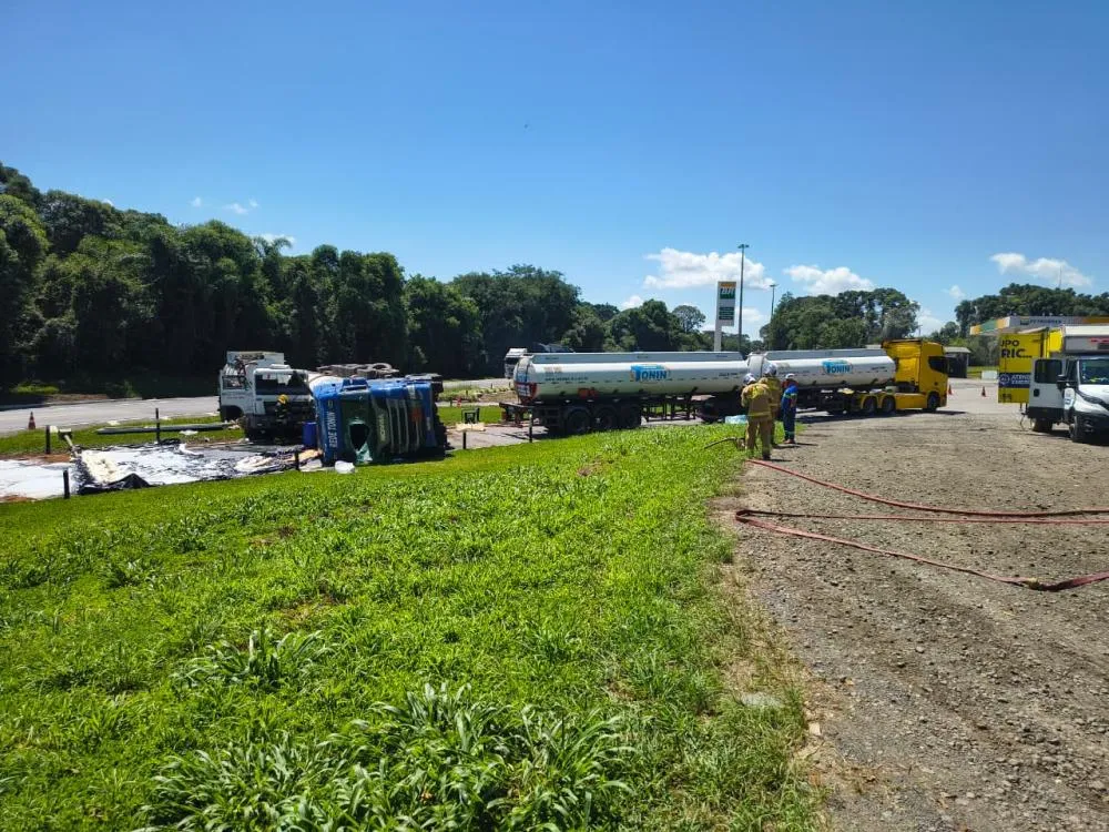 Com o impacto da colisão, o caminhão que transportava combustíveis acabou tombando nas proximidades da entrada de um posto de combustíveis localizado às margens da rodovia.