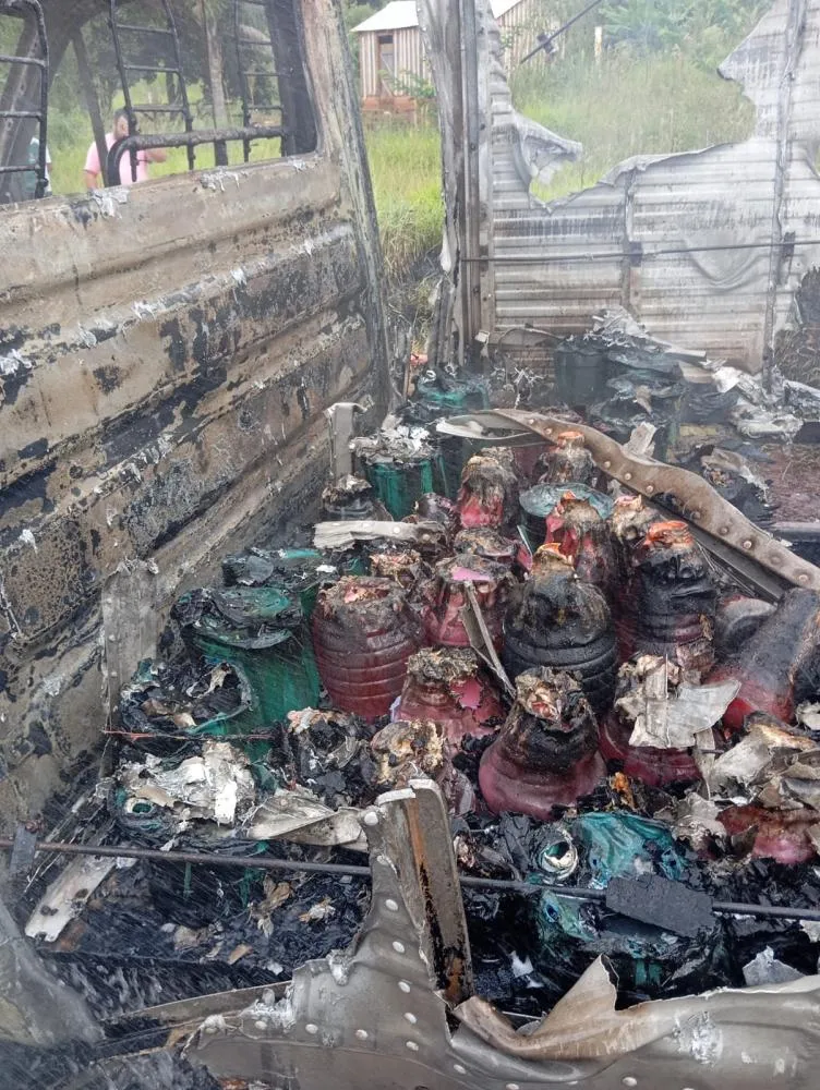As imagens obtidas no local mostram que a cabine e o compartimento de carga do caminhão foram fortemente atingidos pelo fogo, com destruição severa da estrutura do veículo.